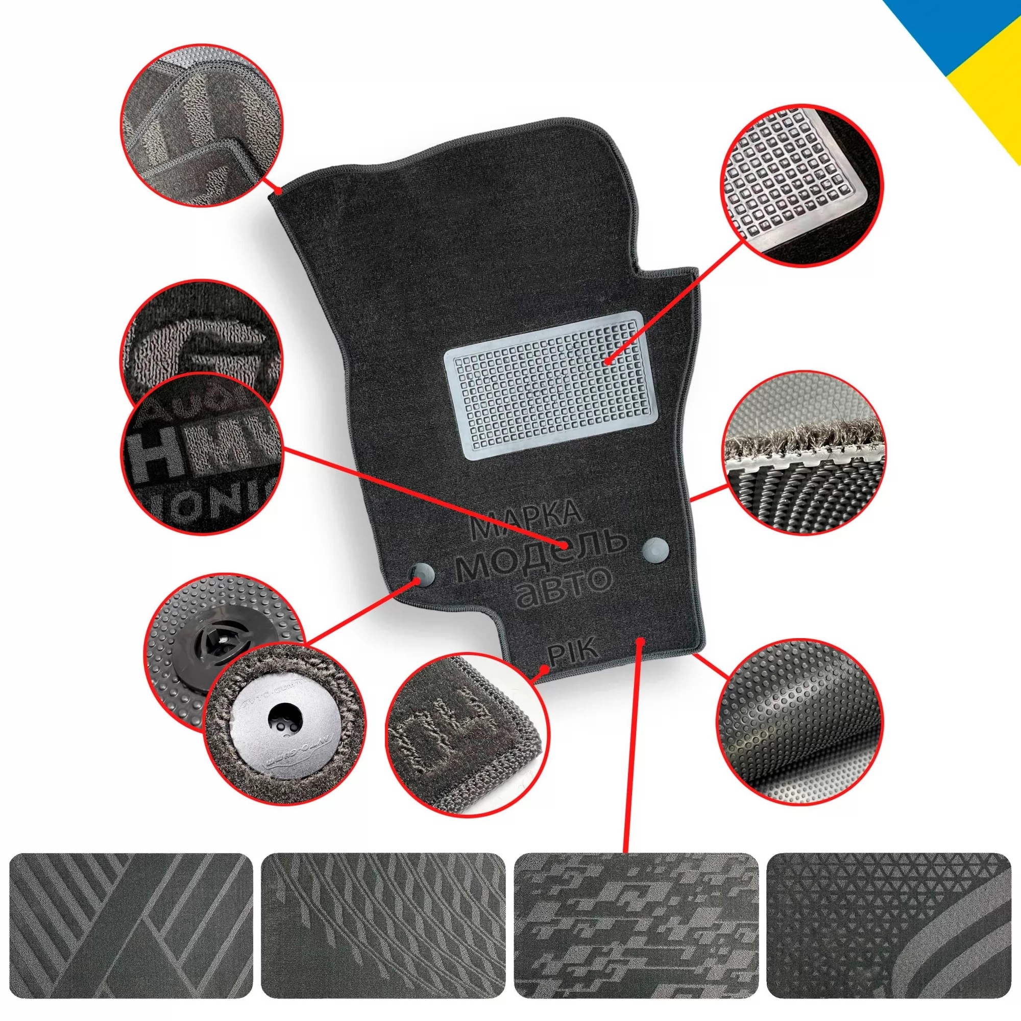 На вибір є 5 варіантів візерунків для ворсових килимків салону або можливе замовлення килимків з вашим унікальним візерунком. Також можливе розміщення написів.